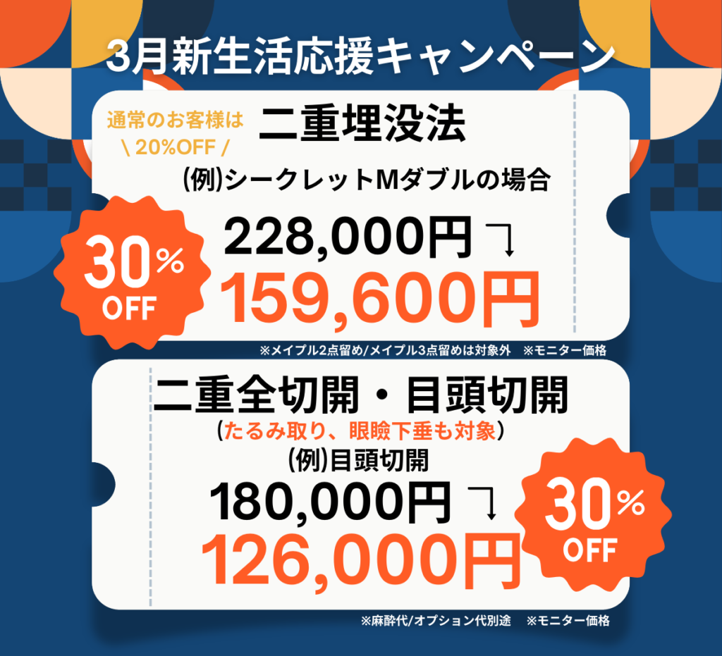 新生活応援キャンペーンとして、二重埋没法や切開法、口元の印象をアップする口角挙上など、お得なメニューが盛りだくさんです!