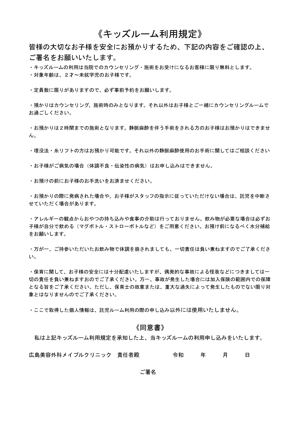 ・キッズルームの利用は当院でのカウンセリング・施術をお受けになるお客様に限り無料とします。